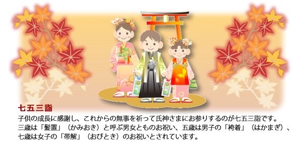 11月15日に、3才の男女児、5才の男児、7才の女児が晴れ着を着て、親子そろって神社にお参りし、子供の成長を神さまに感謝し、これからの無事を祈ります。