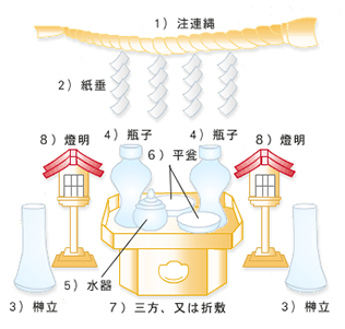 一般的な神棚の周囲にある祭器具のご紹介です。近年ではご自宅の敷地に合わせてシンプルでコンパクトな神棚もございますので、おまつりした神棚に合わせご参考になさってください。